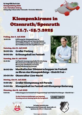 Wir wünschen allen Teilnehmern und Gästen fünf tolle und friedliche Klompenkirmestage in Otzenrath und Spenrath im 50sten Jahr des Bestehens. 50 Jahre auf Klompen sind eine stolze Bilanz und wir sind stolz auf diese Gemeinschaft und das, was wir hier haben und leben.